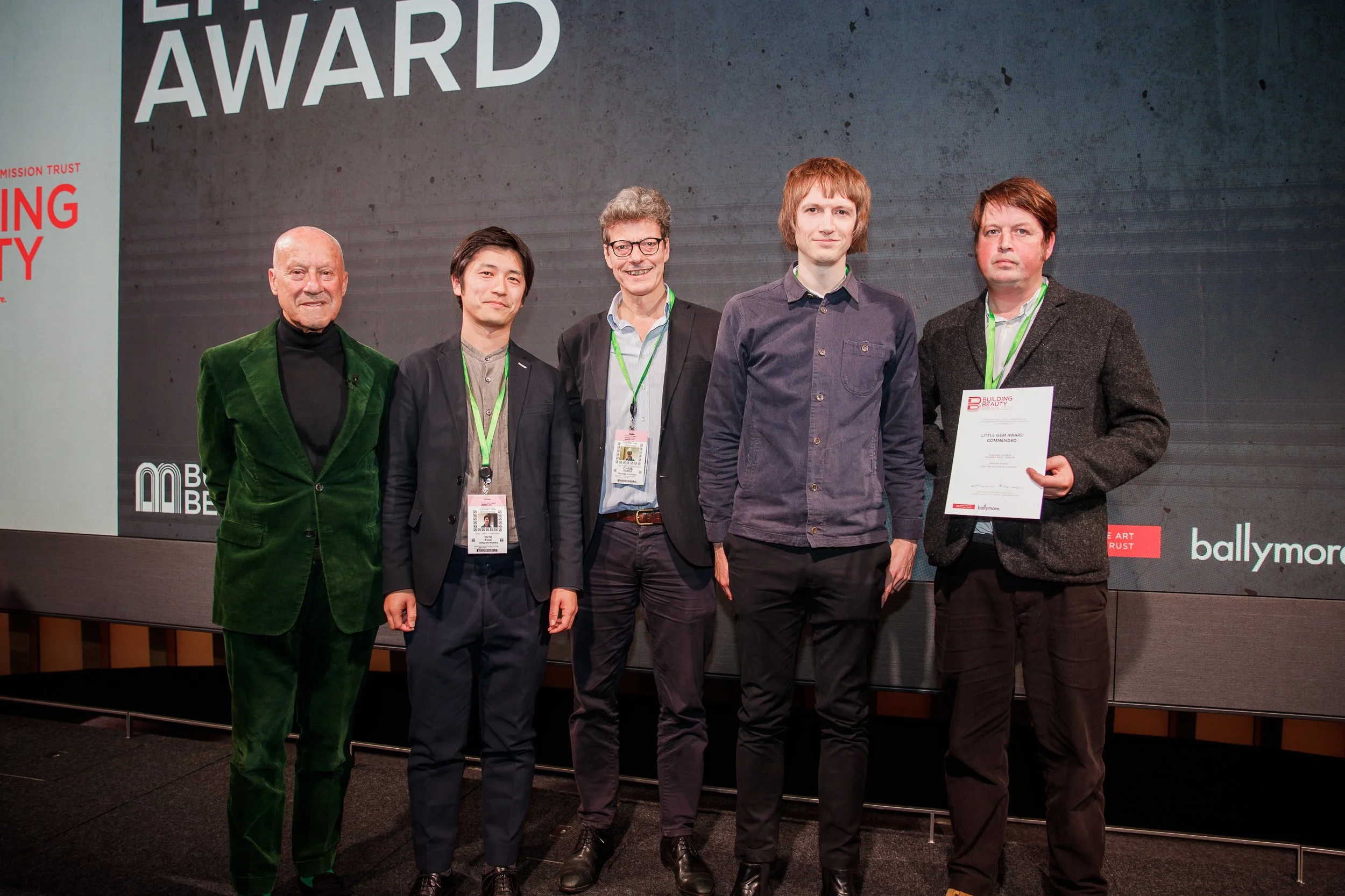 The Floating Church was commended at this year’s Building Beauty Awards, organised by the Royal Fine Art Commission Trust. The awards evening was held at the Bloomberg building and Lord Foster was on hand to present the certificates. He didn’t say so, but I think he liked our project best.