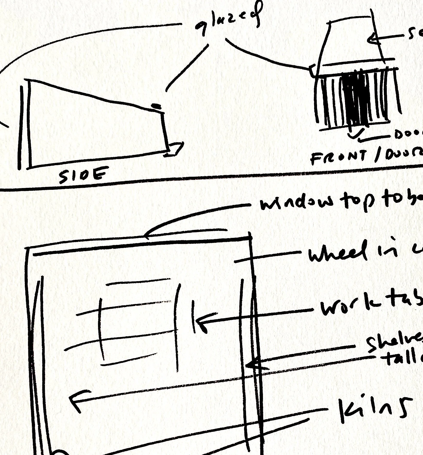 Work continues on one of our smallest project in the office for a ceramics studio in west London designed to include workspace and quiet reading room. As ever, we encourage our clients to get involved in the design process and love when we receive sketches like this one.