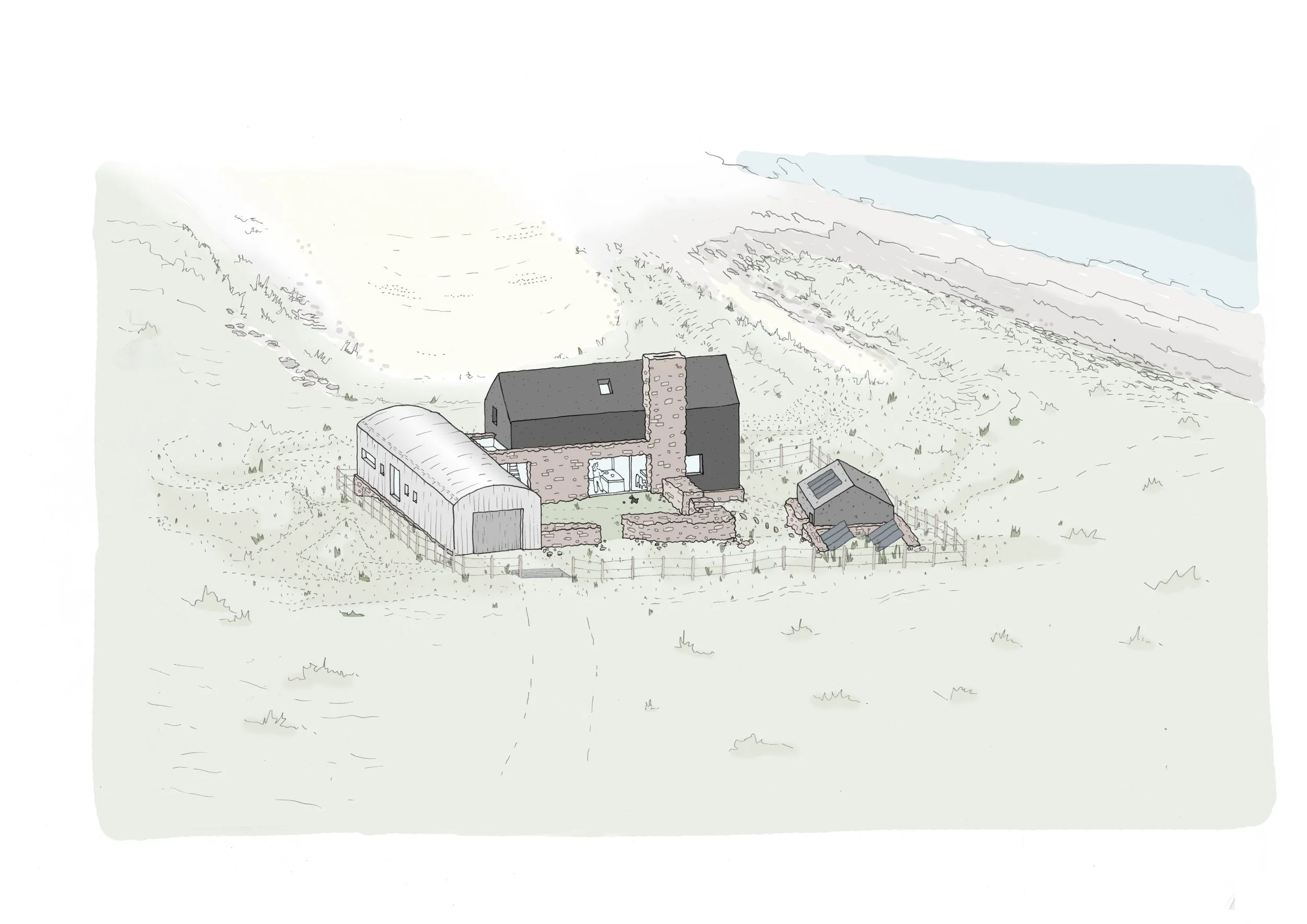 The proposal is for a new-build home stitched into the remnants of a former agricultural courtyard. The forms and materials of the new buildings are inspired by the agricultural context and orientated to maximise views of the landscape, whilst establishing a new relationship with the historic barn structure. This barn will be lovingly restored and accommodate external dining and living spaces, mediating between the courtyard and new living wing.