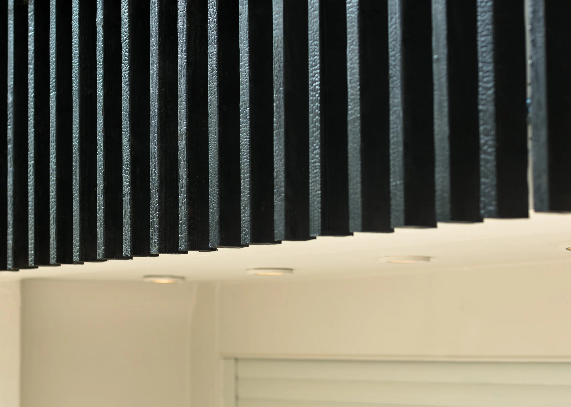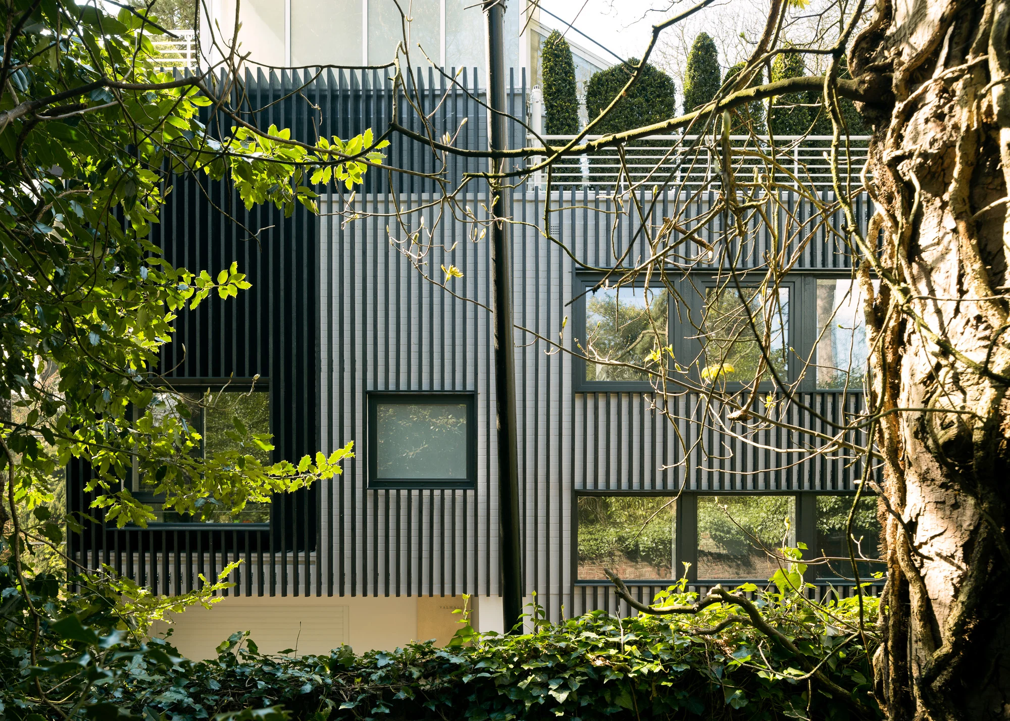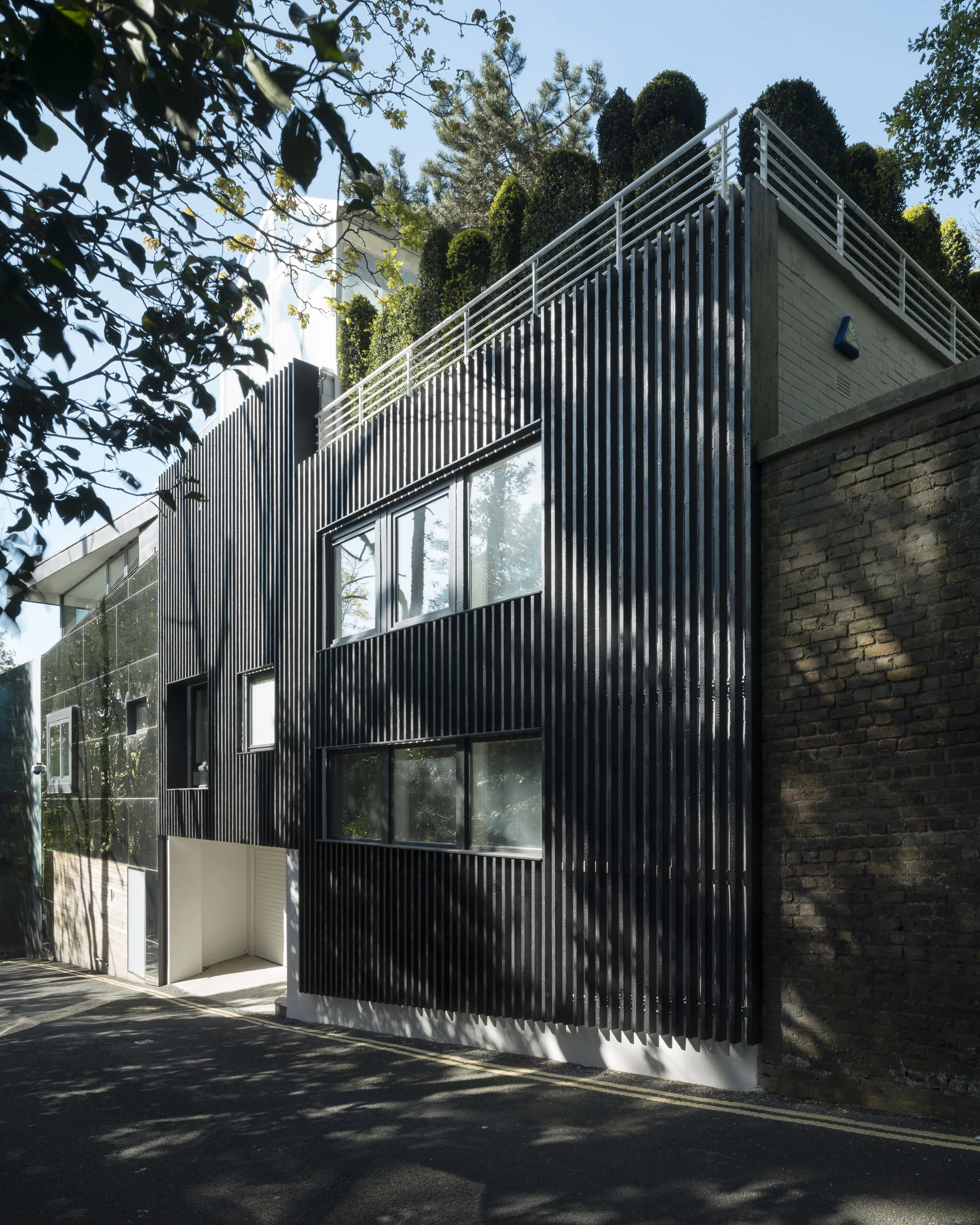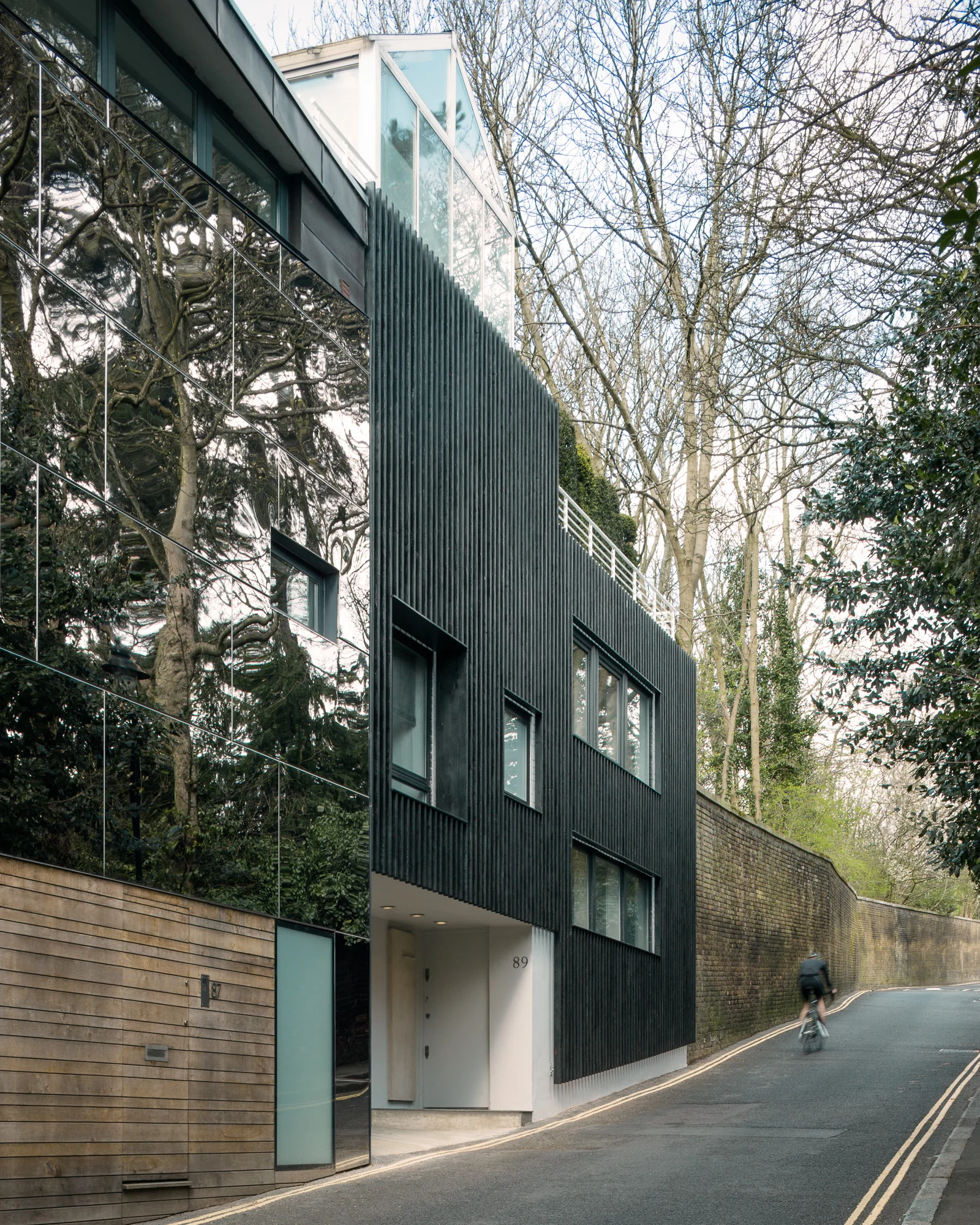 The project references the nearby Highgate cemetery and plays on the reflective material qualities of the immediate neighbour. The charred larch creates a contrast between the two properties, one reflecting the living trees opposite and ours clad in black, traumatised wood.